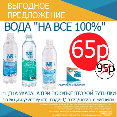 до 31 октября 2025 года при покупке двух бутылок воды «На все 100%» 0,5 цена будет 65 рублей вместо 95 рублей! В акции участвуют: вода...
