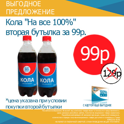 до 31 октября 2025 года при покупке двух бутылок колы «На все 100%» 0,5 цена за вторую бутылку будет 99 рублей вместо 129 рублей! ...