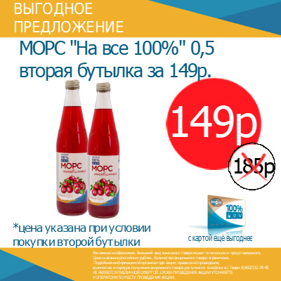 До 31 октября 2025 года при покупке двух бутылок морса «На все 100%» 0,5 цена за вторую бутылку будет 149 рублей вместо 185 рублей! ...