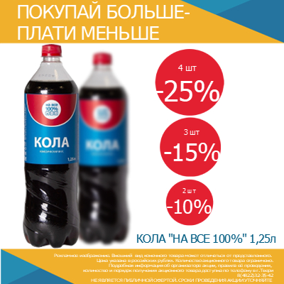 02 Дек Пей больше-плати меньше Posted at 15:39h in Акции, Все новости, Новости by tvernefteproduct Share С 1 декабря 2025 по 31 января 2026 года акция! . Скидка на комплект из двух бутылок колы «На все 100%» 1,25л. — 10%, из трёх — 15%, из четырех — 25%.