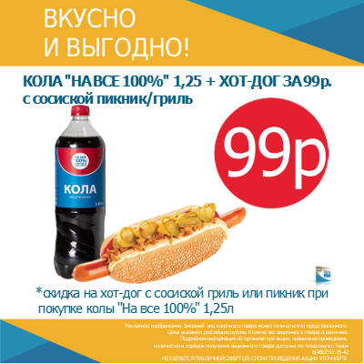 09 Фев ХОТ-ДОГ ЗА 99р. Posted at 15:14h in Акции, Все новости, Новости by tvernefteproduct Share ХОТ-ДОГ ЗА 99р. С 1 февраля по 30 апреля 2026 года при покупке колы «На все 100%» 1,25л хот-дог с сосиской гриль или пикник будет за 99 рублей. Ждем вас на наших АЗС!